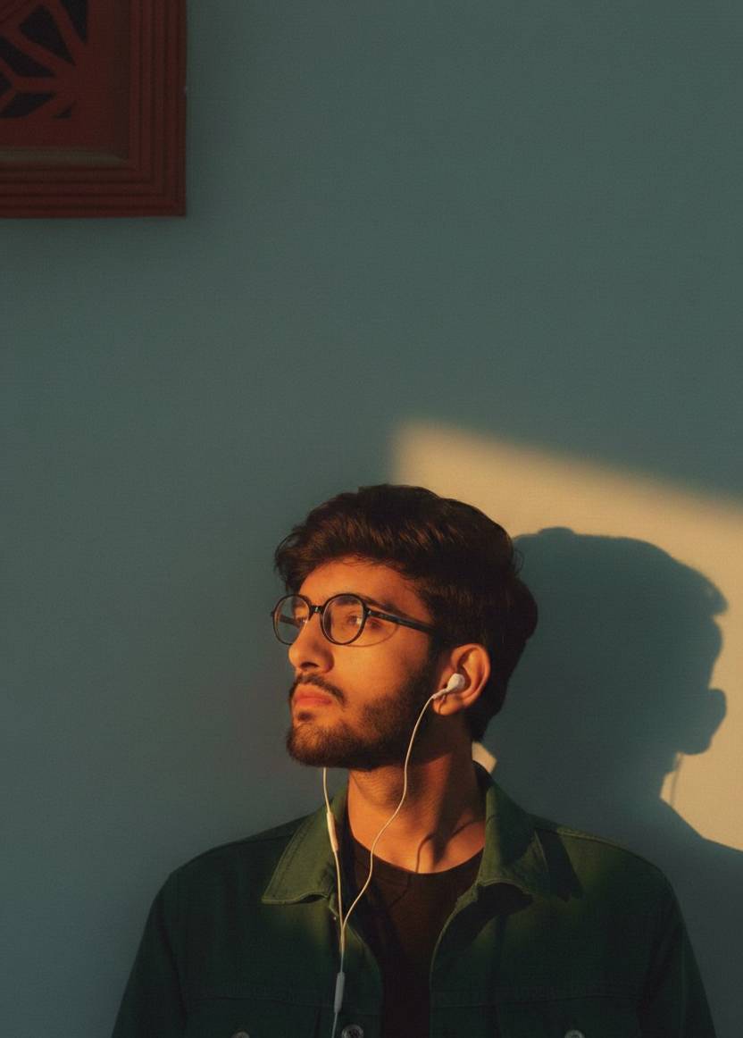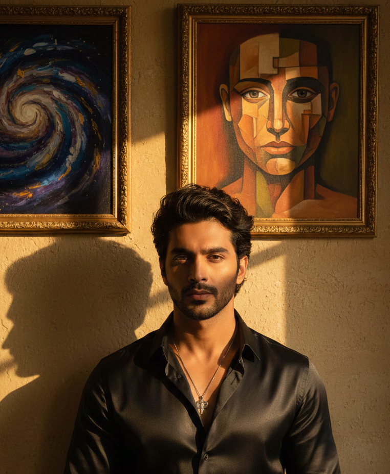 A moody, cinematic 9:16 portrait of the handsome Indian man from the first image, wearing a black satin button-down shirt. He is looking thoughtfully to the side. The scene is lit by warm, golden hour sunlight casting dramatic, sharp shadows of his face and profile onto a plain, textured beige wall. In the background, two framed artistic paintings hang on the wall, partially illuminated by the golden light. High contrast, dramatic lighting, detailed facial features, atmospheric ambiance.